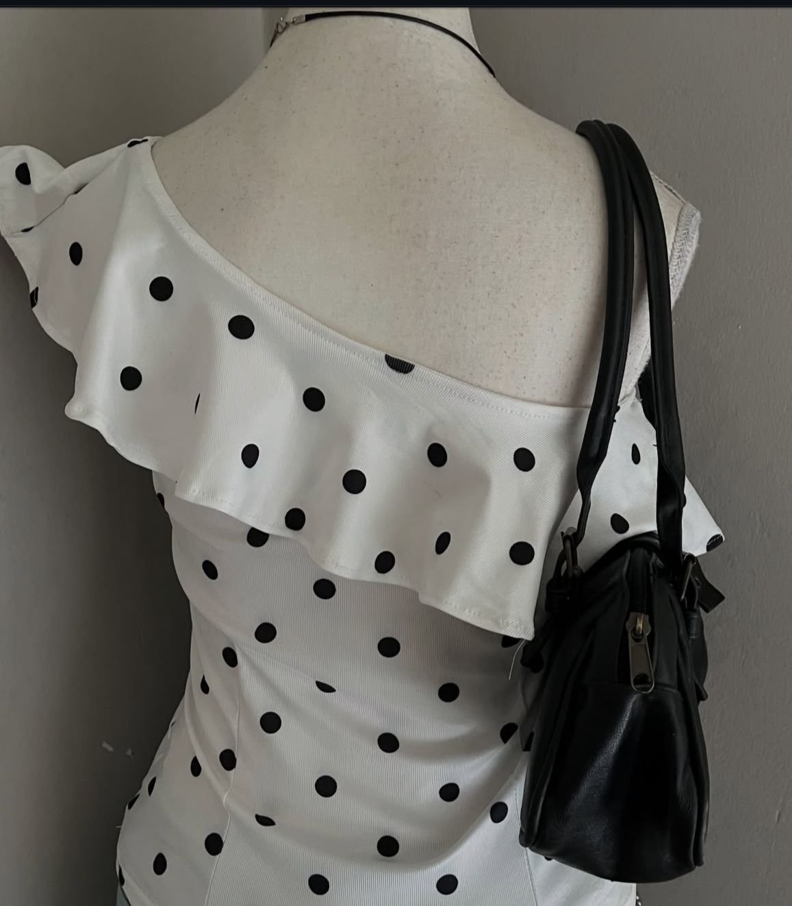 Featuring a sleek one-shoulder neckline and a classic black-and-white polka dot pattern, this top strikes the perfect balance between playful and sophisticated.
